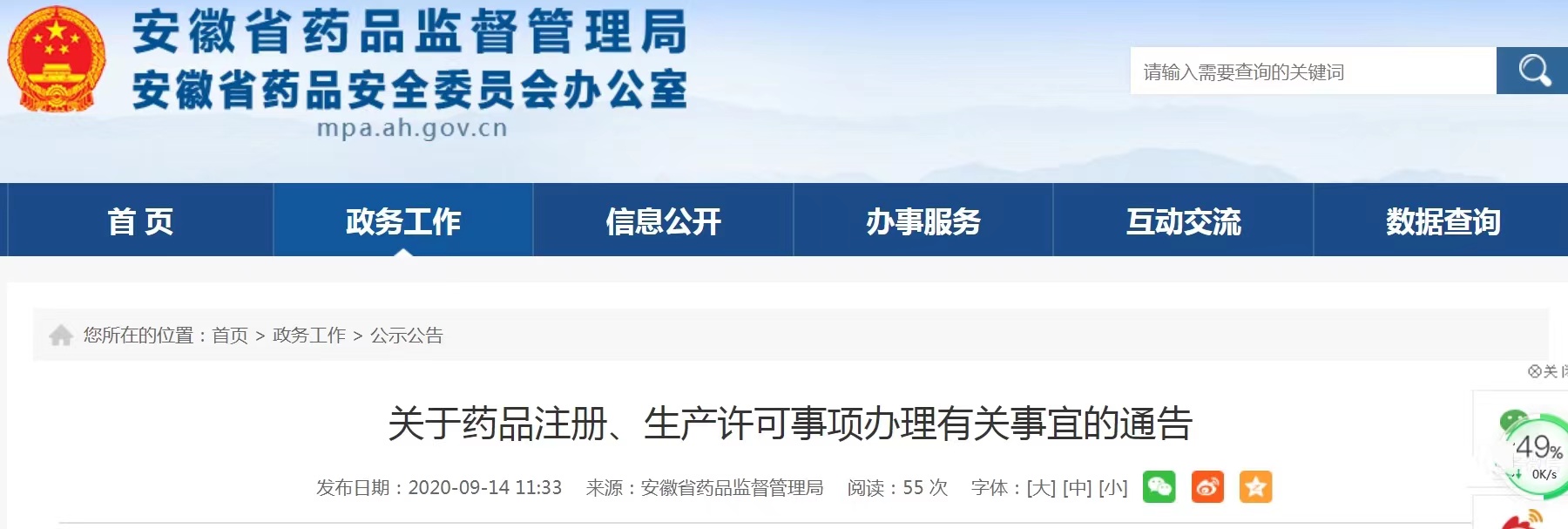 2020年9月14日,安徽省药监局发布关于药品注册、生产许可事项办理有关事宜的通告