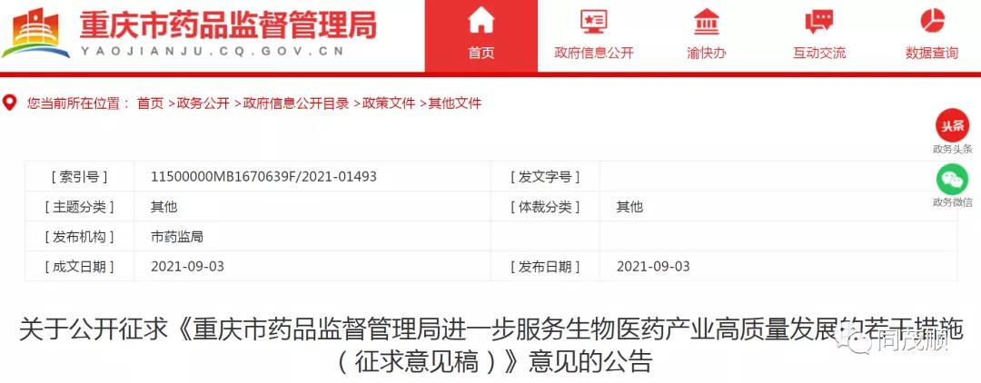 9月3日,重庆市药监局发布关于公开征求《重庆市药品监督管理局进一步服务生物医药产业高质量发展的若干措施(征求意见稿)》意见的公告