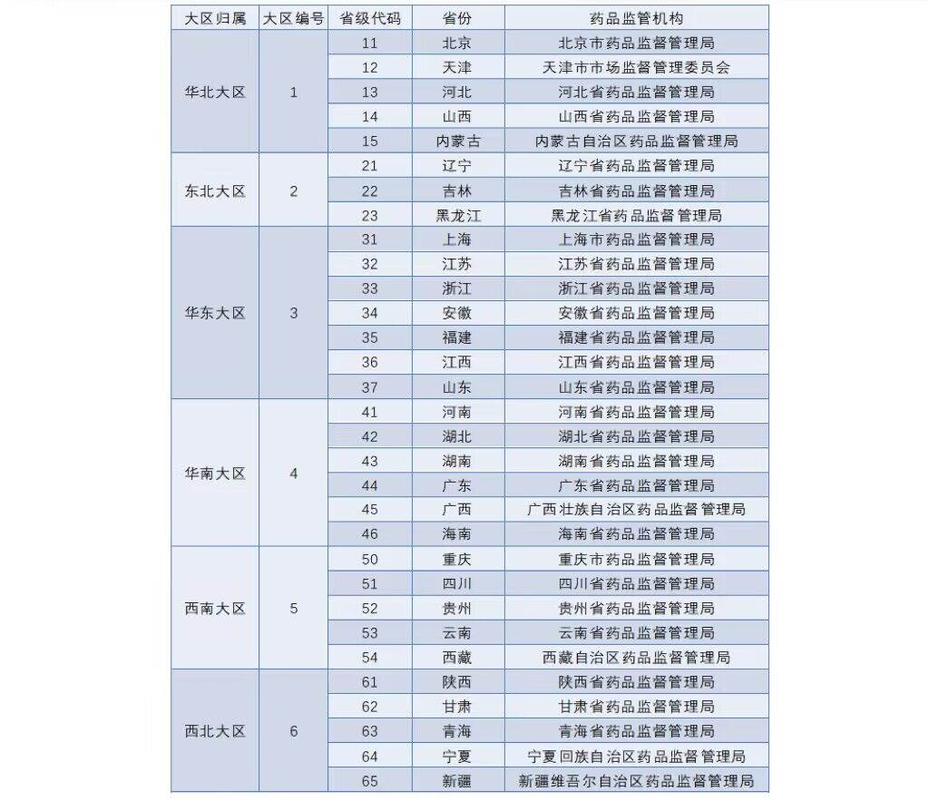 中国大陆共计31个省市自治区地方药监局的机构这个排序的依据是什么?笔者之前也有类似的疑惑,特意检索了一下,原来是按照1949年新中国成立时设立的六大行政区域进行排序的,大区名称(编号)分别为:华北(1)、东北(2)、华东(3)、华中华南(4)、西南(5)、西北(6),全国大陆31个省(自治区、直辖市)药品监管机构排序最新信息,详见下表: