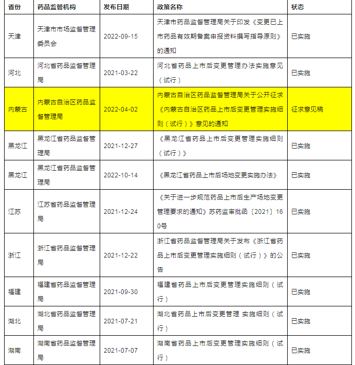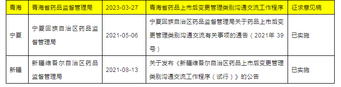 他来了!千呼万唤始出来啦!2023年3月27日,青海省药品监督管理局官网发布关于征求《青海省药品上市后变更管理实施细则(征求意见稿)》《青海省药品上市后变更管理类别沟通交流工作程序(征求意见稿)》意见的函,这是中国内地31个省市自治区第31个省局出台本省上市后变更配套的相关政策,为进一步加强药品上市后变更管理,强化药品上市许可持有人药品上市后变更管理主体责任,规范药品上市后变更行为,笔者汇总分析了截至2023年3月底的国内各省市局已发布的上市后变更配套相关政策,便于五湖四海的制药人,尤其是注册人了解和应用。