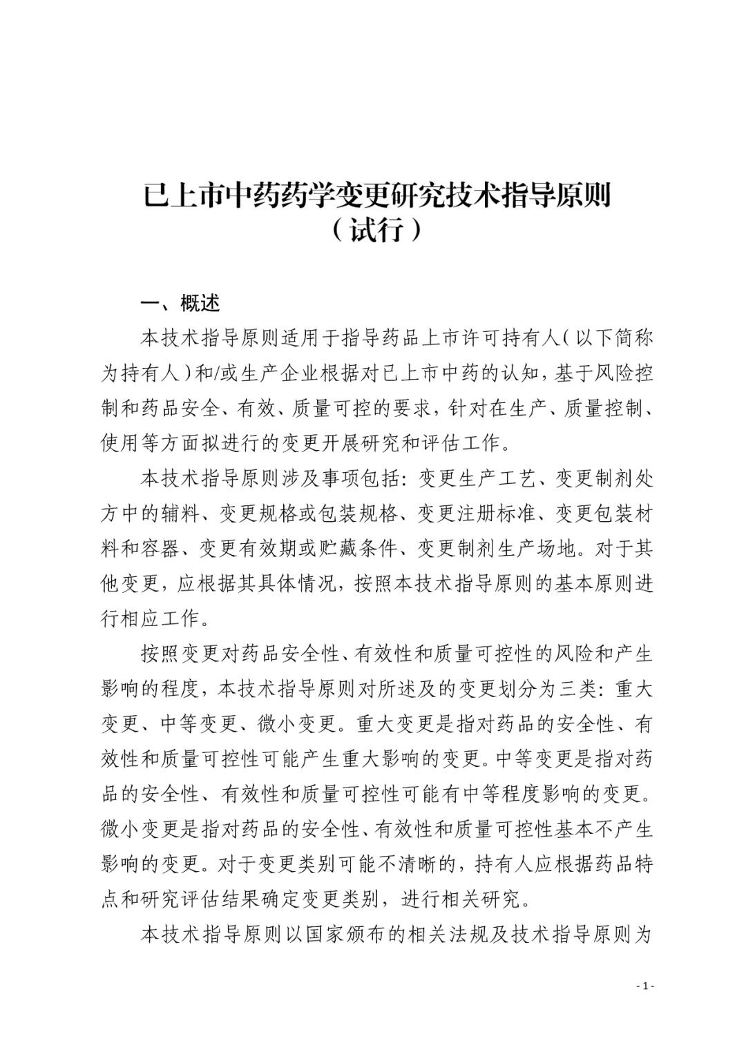 4月2日,国家药监局药品审评中心发布已上市中药药学变更研究技术指导原则(试行)